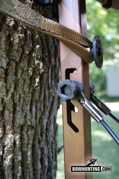 After the stand is hung you’ll notice a few neat features that add to the comfort and convenience of the stand. The first is the leveling features. By moving the adjustment you can set the platform to the level most comfortable to you. The seat also has a screw that allows you adjust its level. There is nothing worse than felling like your about to slide off the seat all night long. The seat also folds up out of the way when you stand, giving you more room to maneuver.