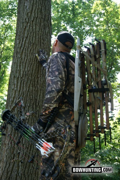 Once you find “The Tree” in a matter of minutes you can be up the tree and seated in the stand ready for the hunt. The procedure I use to hang my stands goes like this. I secure the bottom stick to the tree with the supplied strap. Then I tie one pull up rope to my bow and another pull up rope to the stand. I fasten my lineman’s belt around the tree and throw 2 sticks over my shoulder and carry one in my hand. Once I reach the top step of the first stick I strap on the second stick. I continue strapping on the 3rd and 4th sticks on my way up the tree. Once at the level I want to hang my stand I secure my lineman’s belt into position and pull up my stand. Secure the 2 straps supplied with each stand to the tree and climb aboard. Pull up your bow and you are ready to hunt. This can all be done in one trip up the tree fairly easily with just a little bit of practice, even in the dark.